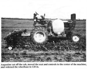 "I built this machine because I didn't like the poor visibility with rear mounted cultivators," says Augustine, who built the self-propelled cultivator a year ago. "During cultivation I use spray nozzles to deliver a 10-in. wide band of herbicide which costs only about one third as much per acre as broadcasting. The 400-gal. saddle tanks are mounted behind the driver's seat where they can't block the view like tractor-mounted saddle tanks do. Also, the driver's seat and controls are centered above the eight rows so I have a good view of weeds coming up. The narrow 16.9 by 26 tires fit more easily between my 30-in. rows than conventional tractor tires do. The best part is that I paid less than $1,000 to build this rig.