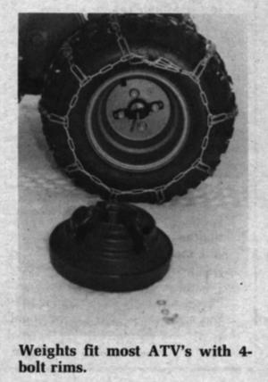 The weights, manufactured by Cycle Country Accessories Corp., Milford, Iowa, weigh 30 lbs. each and fit right on the ATV wheel.