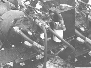 I then mounted the hydraulic pump off the tractor's Charlyn hi-lo hydraulic pack underneath the driver's seat instead of behind the transmission as it had been originally. I drive it with a #60 roller chain which runs on a 1 3/ 8-in. dia. sprocket running on the pto shaft. The chain runs through a hole I cut in a mounting platform, which I made of 1/4-in. plate. I installed a small shelf made out of plate above the pump and mounted a single-acting valve and double-acting valve on it. I installed an oil reservoir on another plate to the right and plumbed up the system, which is complete with an oil return line and pressure gauge.
