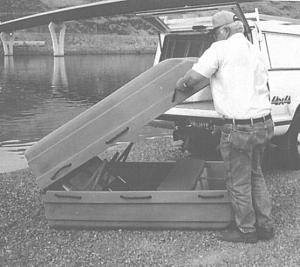 The 3-passenger, flat bottom boat measures 12 ft. long, 4 ft. wide, and 15 in. high and is hinged in the middle so it folds down to 6 ft. long and 30 in. high. It weighs 200 lbs. To use the boat you simply unfold it and place a seat over the hinge, using three sliding, lock action bolts to keep the hinge rigid.