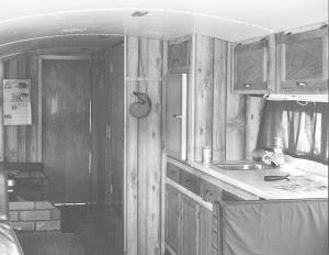 "We first removed the seats and painted the ceiling. Then we installed 110 and 12-volt wiring and panelling below the windows. Next we framed up and paneled a back room, bathroom, and closet. We also installed kitchen cabinets with sink and ice chest, dining area, bunks, and two seats.