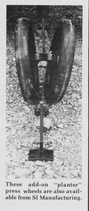 "The V-shape increases the effectiveness of the press wheels in increasing soil-toseed contact but doesn't compact the soil above the seed like a single wheel," says SI Manufacturing representative Ron McCleery, noting that the press wheel assembly also has less adverse effect on seed depth than a single wheel that presses directly down on the seed.