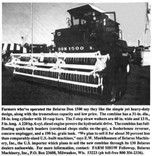 Farmers who've operated the Belarus Don 1500 say they like the simple yet heavy-duty design, along with the tremendous capacity and low price. The combine has a 31-in. dia., 58-in. long cylinder with 10 rasp bars. The 5-step straw walkers are 60 in. wide and 13 It., S in. long. A 220 hp. 6-cyl. diesel engine powers the hydrostatic drive. The combine has full-floating quick-tach headers (cornhead chops stalks on-the-go), a feederhouse reverser, concave unplugger, and a 190 bu. grain tank. "We plan to sell it for about 30 percent less than comparably-sized U.S.-built machines," says E.W. Muehlhausen of Belarus Machinery, Inc., the U.S. importer which plans to sell the new combine through its 130 Belarus dealers nationwide. For more information, contact: FARM SHOW Followup, Belarus Machinery, Inc., P.O. Box 23608, Milwaukee, Wis. 53223 (ph toll-free 800 356.2336).