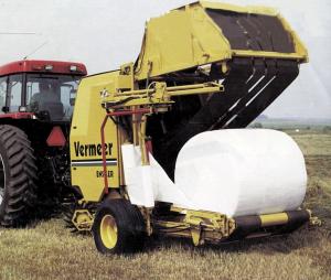Round Baler Also Wraps With Plastic BALERS Balers 22-6-25 Making wrapped silage bales is about as easy as it's going to get with this new all-in-one machine recently introduced by Vermeer. The "Ensiler" was introduced at dealer meetings this fall and will be commercially available for the 1999 haying season. It combines the company's 504 L-Series baler with a built-in automatic wrapping system. The baler is designed to make 5-ft. dia. dry bales or 4-ft. dia. high-moisture, wrapped bales. After the bale is formed, the rear gate lifts and stays up while the bale is wrapped.