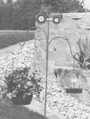 The tractor-shaped gauge mounts on top of a metal pole that's fitted with two hooks for bird feeders or hanging flower pots. The gauge is 68 in. off the ground. The pole just steps into the ground.