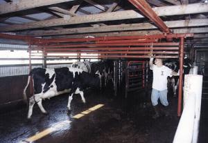 "I had never seen a crowding gate before I built it," says Larson. "Stakenas runs four batches of cows through it two or three times a day."