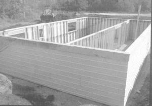 The steel panels sit on a concrete footing wrapped in a 60 ml. rubber boot. Panels are set with a hardened nail into the footing, and the concrete floor is then poured, locking panels in place.