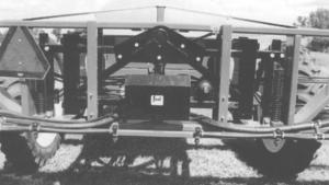 The "center pivot" design consists of a 2-in. dia. bushing at the center of the boom that's connected to a shock absorber and pressure coil spring on each side. A hydraulic accumulator isolates the boom from the trailer. The bushing creates a pendulum effect to keep the boom parallel with the sprayer frame, and the shock absorbers keep the boom from bouncing.