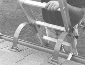 The brackets slide onto the ladder side rails and tighten down with hand knobs. They arch over the edge of the roof to put the weight of the ladder directly on top of the roof. Rubber-bottomed pads adapt to any pitched roof and you can slide the brackets up and down the ladder as needed.