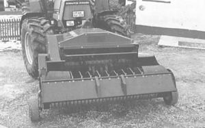 Built by Greenland, the unit consists of the front half of a baler - pickup, chopping system, and deflector plates - mounted on wheels. It lays down an even swath for the baler to pick up, helping to make more even-shaped bales. Swath width can be varied to fit the baler's pickup width.