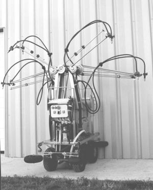 The 4-WD Swedish-built robot is designed to work its way through a barn by itself so no operator needs to get soaked washing walls and ceilings. The machine is equipped with four stainless steel booms with eight spray nozzles that can be set to remain stationary or to rotate back and forth. With the arms fully extended total boom width is 20 ft. A chain and sprocket system is used to adjust boom angle and height. Each nozzle is fed by a separate rubber hose. A hand screw knob is used to adjust nozzle setting.