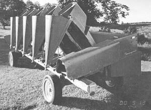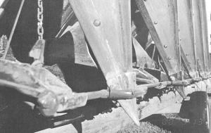 Tipped-Up Row Dividers Reduce Corn Header Width COMBINES Accessories 25-2-13 When Ronald Boehm bought a new Case-IH combine equipped with a 6-row corn header, he built a trailer to transport the header. However, he lives in an area with narrow and winding roads so he feldt the 9-ft. transport width was dangerous. His solution was to tip the snouts up and secure the tips in "pockets" welded onto a 12-ft. length of 5/8-in rebar. The rod rests in the channels on the header that support the dividers when they're in harvest position.