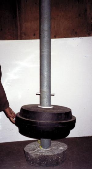 They started with 5-ft by 4-in. fence posts made from recycled plastic. To these, they add a float capable of holding up 85 lbs. A 65-lb. concrete weight is fixed to the bottom of the post. An aluminum pin above the float, about 2 ft. from the bottom of the post, keeps the float from sliding up the post, and leaves 3 ft. at the top on which to fasten the wire. Another pin a couple of inches from the bottom is inserted before the post is set in concrete to keep the concrete weight in place.