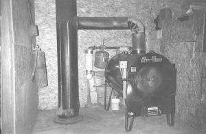 Aqua-Therm woodburning stoves are designed to go outside but Keith Switzer decided to put one inside his 60 by 45-ft. shop and use the heat that radiates from the stove to heat the building. He ordered the stove without an insulation jacket around it. Otherwise, the stove operates normally, pumping hot water to the house through an underground pipe.