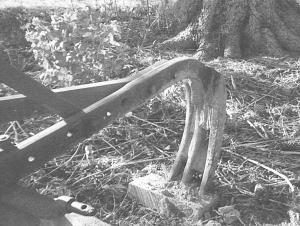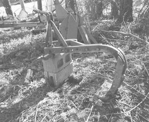 They started with an old three-point mounted Ford two-bottom plow. They removed the front beam and everything but the shank from the rear beam.