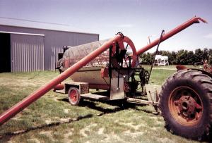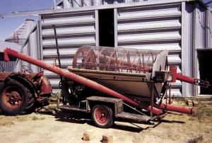 To load the cleaner, Haubrich swings the loading auger out at a 90 degree angle. It drops grain into a small hopper just ahead of the drum. The unloading auger that carries away clean grain swings upward and outward from the back part of the cleaner, via a pair of hand-operated winches.