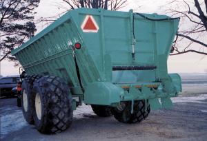 The spreader has sloping sides that measure 9 ft. wide at the top and 5 ft. wide at the bottom and is 22 ft. long. The undercarriage, wheels and axles were purchased from Houle Mfg. The sides are made from 1/4-in. thick steel reinforced with vertical tubing. A heavy duty, 5-ft. wide apron chain at the bottom delivers manure under a gate and to a beater on back, which spreads the manure in a pattern about as wide as the wheels.