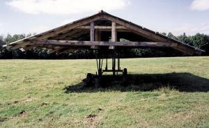 The open-sided shelter is basically a roof on wheels. It consists of wood trusses and metal roofing mounted on a pair of wheels and axles off an old wagon. A 6-ft. high steel support structure welds to both axles. A tub containing minerals and salt is fastened to the rear axle. To move the barn, Gabriel simply raises the arms on his skid loader and pushes against the frame at one end of the shelter.