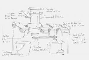 He obtained a discarded stainless steel disposal for free from someone remodeling a kitchen and then made a stand from wooden pallets. He then removed the casing and electric motor from the disposal and mounted a pulley on the armature shaft, which he drives with a 1/3-hp electric motor.