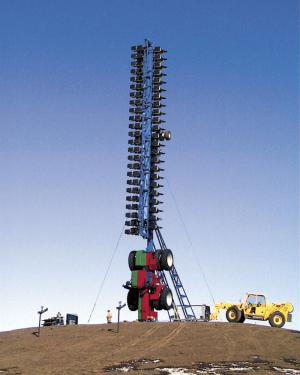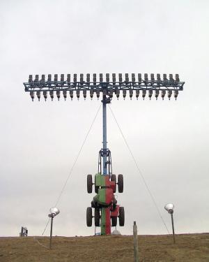 What Kinze did was to mount a 24-row Kinze planter behind a 4-WD tractor and put it all up in the air, with the tractor nose heading down into the ground. It stands 85 ft. tall and folds and unfolds periodically throughout the day.