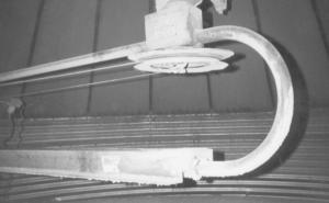 Shield Solves Bin Stirrator Problem GRAIN HANDLING Accessories 27-5-36 Steve Spiering, 48594 Hwy. 158, Milbank, S. Dak. 57252 (ph 320 568-2246): "The cable on my bin's stirrator kept falling off. I had to put the cable back on up to four times a day, which got old. I solved the problem by welding on a shield off a rolling cultivator, which provides the pulley with a deeper flange. I started with a shield that matched the size of the pulley and cut off all the teeth. Then I welded the modified shield onto the pulley. The replacement flange deepened the pulley. Since I made this modification two years ago the cable hasn't fallen off once.