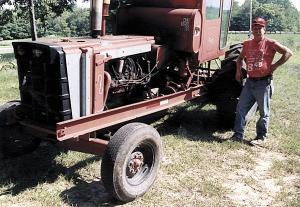 The first step to building the combine mower was to drop the engine down to rest on the frame of the IHC. "The framing had to be moved closer together to support the engine. Then the frame was reinforced by 6-in. steel channel iron," says Bob Smith.