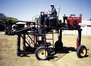 He started with the frame and wheels off an old rod weeder. The sicklebars are off a Versatile swather and are driven by pitman drives off old horse-drawn mowers. Power is supplied by a Wisconsin 4-cyl. gas engine that belt-drives a pair of hydraulic pumps. Steering, as well as all other operations, are lever-controlled. The seat came out of a Toyota.