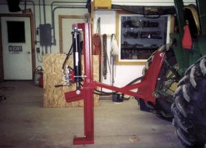 Home-Built Log Splitter WOODLOT EQUIPMENT Wood Splitters 28-6-42 We have an outside wood burning stove and cut a lot of wood during the fall. It's something our entire family enjoys. To provide wood for the stove I built this log splitter, starting with an upside down piece of railroad rail. The rest was made from heavy channel iron and whatever was needed to beef it up. I bought the hydraulic cylinder, hoses, and cutting wedge new, along with a few pieces of metal that I didn't have in my scrap pile. The unit slips down to work in either the horizontal or vertical position. We usually use it in the vertical position so we don't have to lift pieces of wood. My younger sons are 9 and 11 and they can roll pieces of wood to me for splitting. Total cost of this heavy-built unit was about $400.