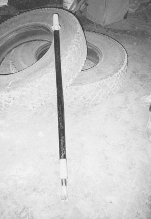 Karl Oysmueller, Pink Mountain, B.C.: "I made a tool for knocking tire beads off wheel rims when changing or patching tires. It's quite simple. A solid steel rod fits inside a larger pipe. At the bottom of the pipe, there's a short length of rod flattened to form a wedge. This wedge is free to move up and down about 1 1/2 in. on top of a spring that's held in place by two welded-on collars. The flattened end is pushed between the rim and the tire. Holding the pipe with one hand, I use the inside rod to hammer on the bottom piece which forces the bead off the rim. It usually takes just a few blows to knock the bead off. I've used it on everything from car tires to big truck tires."
