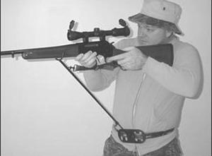 The "Steady Aim" fastens to your belt and comes with a shoulder strap that supports the butt of the gun to keep it from sliding down. A telescoping metal rod connects to the buckle plate which is attached to your belt. The rod has a soft neoprene-coated yoke that supports your gun's stock. You put the shoulder strap over your head and under your arm pit, then snap the shoulder strap onto a hook on the rod. By adjusting a thumb screw, you can adjust the length of the rod in 1/2-in. increments to set the gun's height. The yoke is wide enough to accommodate the stocks of most guns.