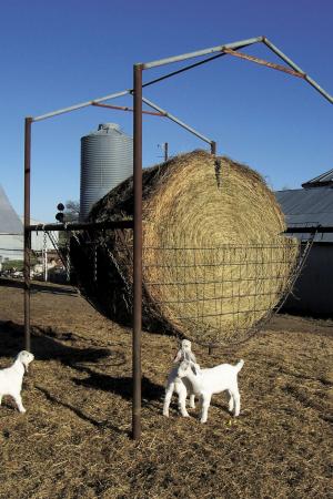 Gail Truax and her husband, Gary, came up with the idea to feed goats. "We can put 30 to 40 does on it with their babies, and it works real well. It's up off the ground, so the babies can get up under it and start eating early."