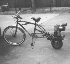 Wilson bought a bike, took the back wheel off and put a 3 1/2 hp rope-start motor with a chain drive on top of the hand-crafted platform that holds a new 8-in. tire with sprocket. The motorbike has a throttle, choke, and centrifugal clutch along with front and rear brakes.