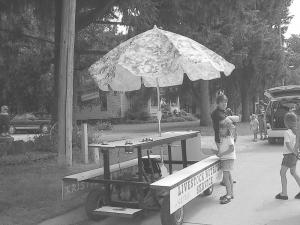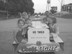 They started with a Deere model 68 riding mower's chassis and then built a table on top of it. Meitner admits the drive unit is small, but they haven't broken anything even when hauling more than 500 lbs. uphill over rough terrain.