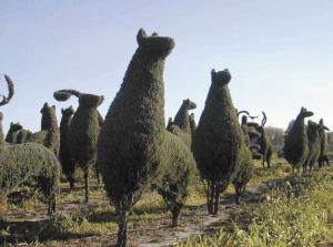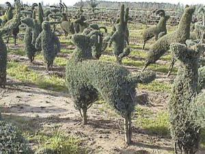 More than 30 plant sculptures are available. They're made out of hardy arborvitae and junipers and shipped in pine boxes to garden centers and wholesalers who retail to the public. The plants thrive on fertilizer and water and should be sheared twice a year.