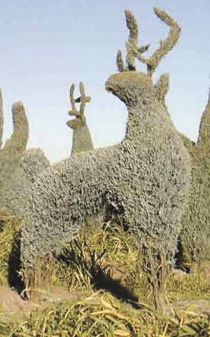Plant sculptures include bear, deer, elephants, giraffes, fish, cactus, sunflowers, penguins, gazelles, horses, and many more. "The sunflower, cactus, and deer seem to be the most popular forms," says Nelson.     The company does custom requests, but says they've learned that they can't do anything that requires a lot of detail. "We've successfully done horses and riders, and even whole families for people," says Nelson.
