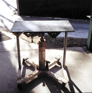My homemade 21 by 36-in. hydraulic welding table is the "cats meow" for welding or grinding on smaller projects. It's made from a foot-operated transmission jack originally designed to take transmissions out of vehicles. The jack came equipped with a 2-stage hydraulic cylinder on top of a cross frame and rode on four caster wheels. I bolted a pair of telescopic legs to the cross frame, then welded a 1/2-in. thick, solid steel plate table on top of the legs. The telescopic legs can be extended from 34 in. to 7 ft. high and the jack will lift up to 1,100 lbs. A big advantage is that I can weld parts right at waist height, which eliminates bending. Parts can be clamped to the table for welding. The unit weighs about 300 lbs.