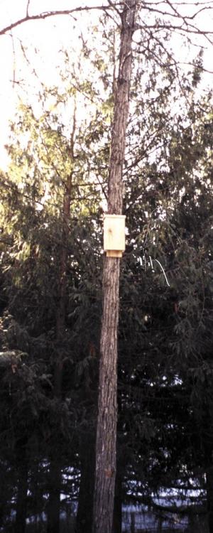 My homemade bat houses greatly reduce problems with mosquitoes. They're made from rough cedar and measure 1 ft. high by 10 in. wide and deep. Bats enter through a hole at the bottom. The houses accommodate 15 to 20 bats. I mount them on trees about 12 ft. off the ground.