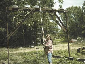 Al Martin of Sidney, Ark., read a recent story in FARM SHOW about growing tomatoes upside down in 5-gal. buckets. He took the idea one step farther, building a 12-ft. high metal rack with several 5-gal. buckets on it. Tomatoes grow out the bottom and peppers grow out the top.