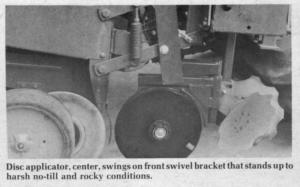 Designed to place starter fertilizer 2 in. to the side of and below the seed, the "Swivel Starter Placer" is fitted with disc blades slightly offset to make a sharper trash-cutting edge and they're set at a narrow angle for minimal seedbed disturbance. A spring-loaded scraper inside keeps them clean in wet conditions and the Deere-built discs have a heavy duty hub and bearing assembly.