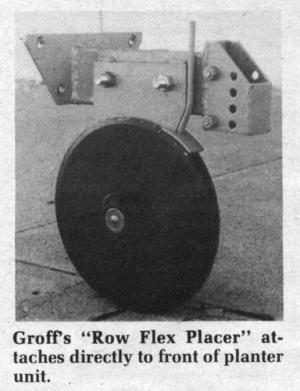 Groff also makes a "Row Flex Placer" which mounts directly to the front of the planter unit giving row flexibility in rough ground with large planters without flexible toolbars. It features the same durable minimal seedbed disturbance design as the Swivel Starter Placer.