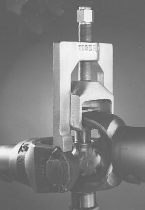 The "Tiger" U-joint puller is equipped with a threaded bolt on top and a pair of steel "legs" that mount on the driveline or on the U-joint cross. To remove bearing cups (even those that are rusted), slip the U-joint puller over the yoke and turn the bolt to press the cup out (you can catch the ejected bearing cup with your free hand). Repeat the process on the remaining three sides of the yoke.