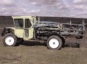 Proper ground clearance is achieved using custom made 11.2 by 24 wheels. The truck is equipped with a Blumhart pickup sprayer with a 45-ft. boom. It's powered by a Chevrolet 350 engine and can be driven safely at 35 mph on the road.