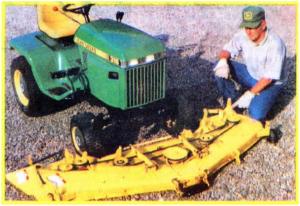 Double Deck Deere FARM HOME Lawn Mowers (31h,38) 17-4-1 An Indiana farmer who grew tired of the 3 1/2 hours it took him to mow his 1 1/2 acre lawn widened the deck on his Deere 318 riding mower by cutting apart an identical 48-in. deck to make 16-in. "wings" that increase the mower's total cutting width from 48 to 80 in.