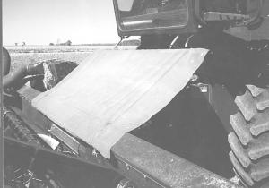 Huygen made a "header hood" to control debris and dust out of a spring-loaded can-vas truck tarp stretched across the gap between the cab and bottom of the feederhouse.
