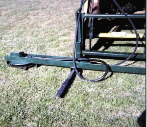 The unit attaches to two 4-in. angle iron pieces that bolt to the tractor's forks. It's powered by the tractor's hydraulic system.