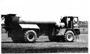 Mike Laframboise, New Haven, Vt., needed a high-capacity self-propelled liquid manure spreader that wouldn't compact the heavy clay soils in his area. He built his own articulated steering, 4-WD rig using parts from an industrial Trojan 2000 payloader and a 1972 Mack cab-over truck, mounting an 18-ft. long, 3,800-gal. tank on big, low-pressure tires designed for log skidders.