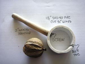 The nut holder consists of a 1 -in. dia., -in. long section of schedule 40 pvc pipe that's screwed to a 3-in. long wooden handle. The pipe is used to contain the nut and has a slit in it that allows the pipe to expand.