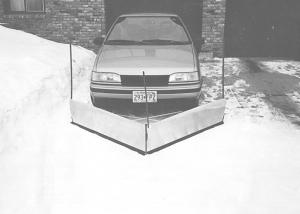 The "Kar-plow" is a lightweight V-shaped snowplow that attaches to any car, mini van, or pickup. Made of plastic, it weighs about 35 lbs. and attaches to brackets on the front end of the vehicle. The brackets install in about 30 min. and stay on the vehicle until the winter is over. Once the harness is in place, you can attach or detach the snowplow in about the same amount of time that it takes to open and close the hood of the car, says inventor Gregg Knutson.