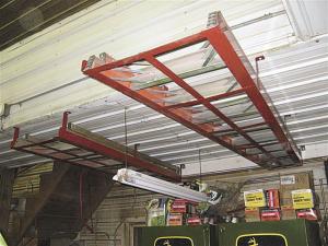 "The racks were pretty easy to build and are made of 2 1/2-in. formed angle and miscellaneous flat straps for bracing. I made each of them in less than 1 hr. and they were inexpensive, as far as the materials I used. I painted them, and then bolted them to the ceiling of my loft area in my shop. They're low enough that I can just reach up and pull the stepladders out.