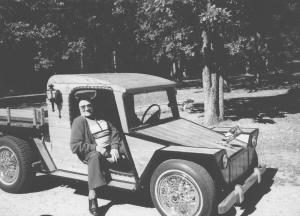 The redwood with oak trim flatbed sits over the engine. Ramberg used an older style Volkswagen engine. The fan, bolted to the back end of the crankshaft rather than on top, left more room for the bed.